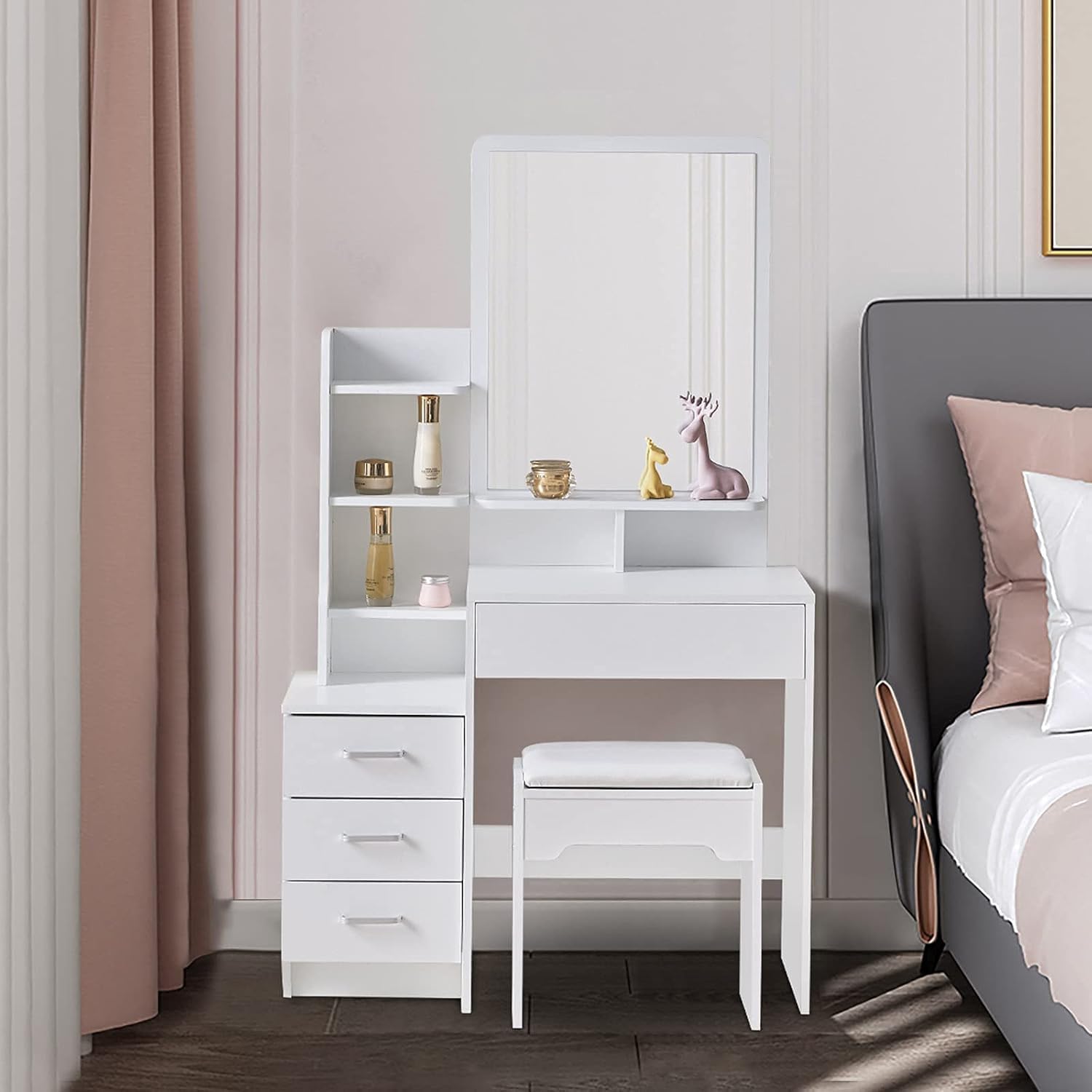 Comes with a matching mirror and cushioned stool (optional), completing the vanity experience.